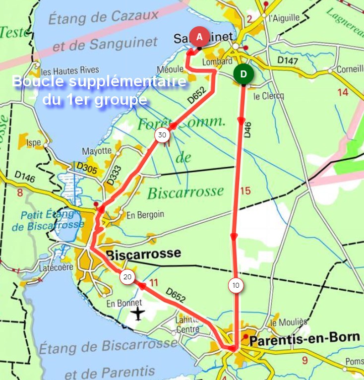 SORTIE SANGUINET du 30 AVRIL 2025 Pour les groupes 1 & 2 : parcours de 160 kms N° 21150472 sur openrunner - Départ à 8h au Broustic - 112 kms pour rallier Sanguinet Pour le groupe 3 et ceux qui sont en retour de forme : parcours de 123 kms N° 14527731 - Départ à 9h - 75 kms pour rallier Sanguinet Déjeuner vers 12h15 - 12h30 au restaurant le Catamaran Le retour à Andernos prévu vers 16h30 Les circuits proposés ci-dessous. Les Inscriptions sont closes... |