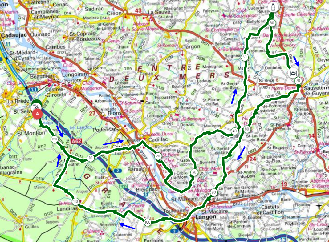 SORTIE RIVE DROITE Sauveterre de Guyenne du 21 Sept. 2025 - Départ à 8h30 sur le parking à St Selve à côté de la mairie - Circuit de 125 kms D+950 m, possibilité de réduire le circuit à Cadillac ainsi qu'à St Brice - Repas vers 12h30 à l'Auberge St Jean Baptiste à environ 2kms de Sauveterre de Guyenne au km 75 - Retour vers St Selve pour récupérer les voitures et retour à Andernos vers 17h - Inscriptions ci-dessous au plus tard Dimanche 14 septembre 20h. - Lien openrunner : https://www.openrunner.com/route-details/10132371 |